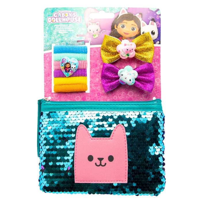 Čudovit set dodatkov za lase vsebuje; šest elastik, dve sponki z bleščicami in bleščečo kozmetično torbico.