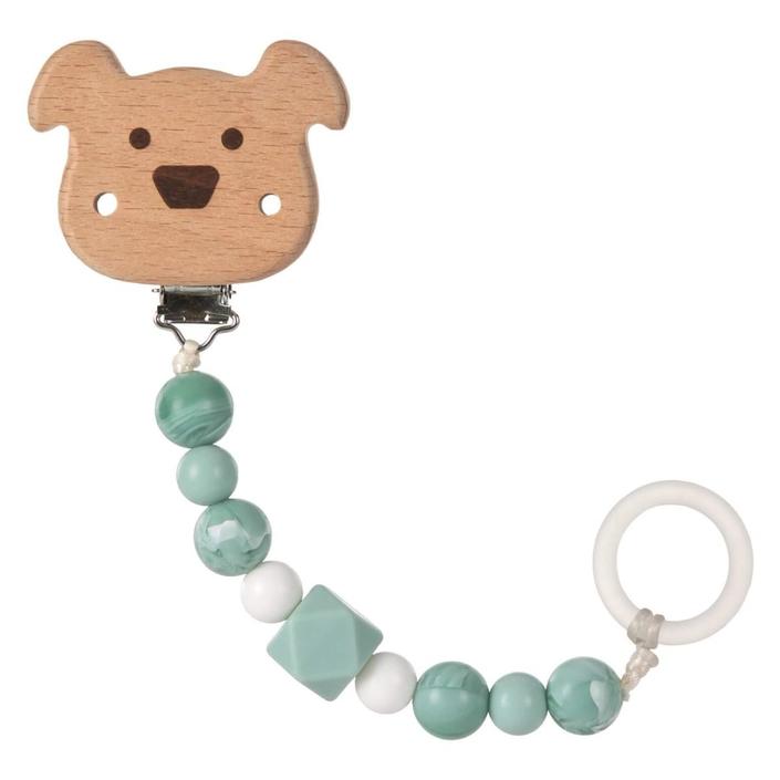 Држач врвка за цуцла изработена од дрвена тока и врвка, со силиконски обрач. Без БПА –